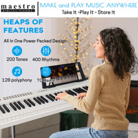 The Maestro Piano Keyboard contains a combination of 400 Sounds and Rhythms. It has 200 sounds ranging from piano-rich strings and huge modern synthesizer effects, right up to the crisp clean bells and Xylophones you find in orchestral percussion. It is packed with 200 Rhythms to which you can also play along and record a song that inspires you musically from a smooth ballad, latin percussion rhytm section, Rock n Roll or a pulsating disco beat and if that is not enough, it has a built in Intelligent one-finger Chord function that makes you sound like a one-man band arranger section following your chordal selection.